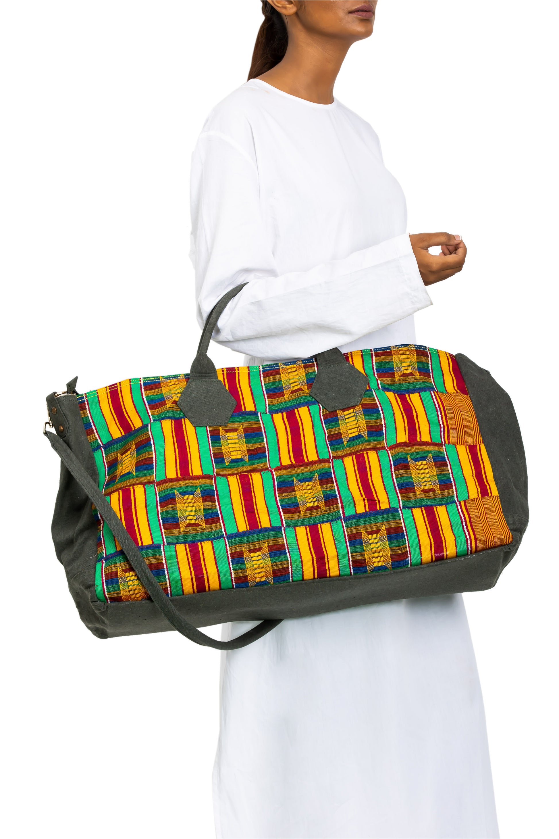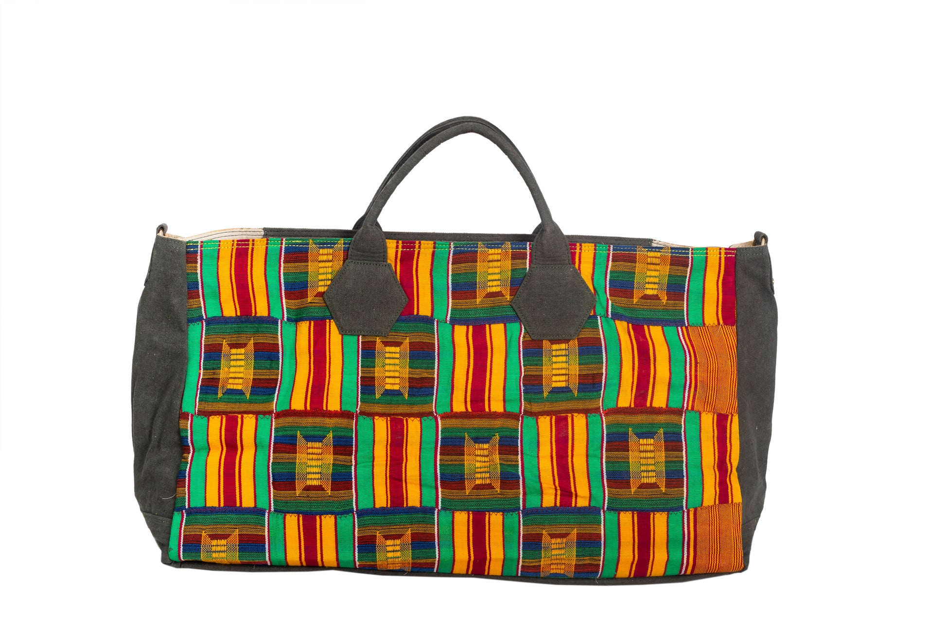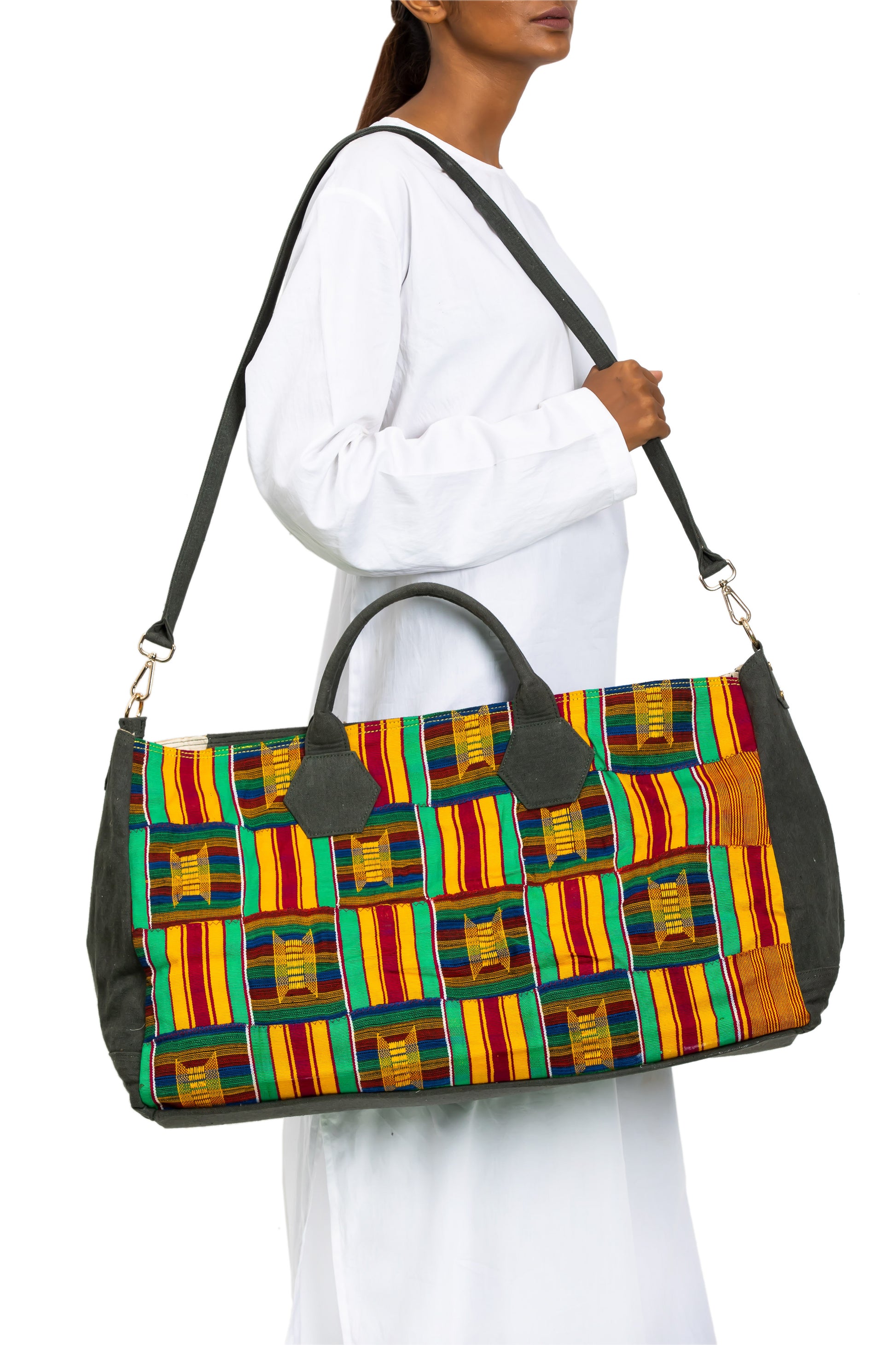 Oversized SAMURA nomad bag is a perfect companion on your inter-dimensional and other kind of journeys. This bag features vintage Ewe Kente Clothes from Volta region, Ghana on a canvas base.