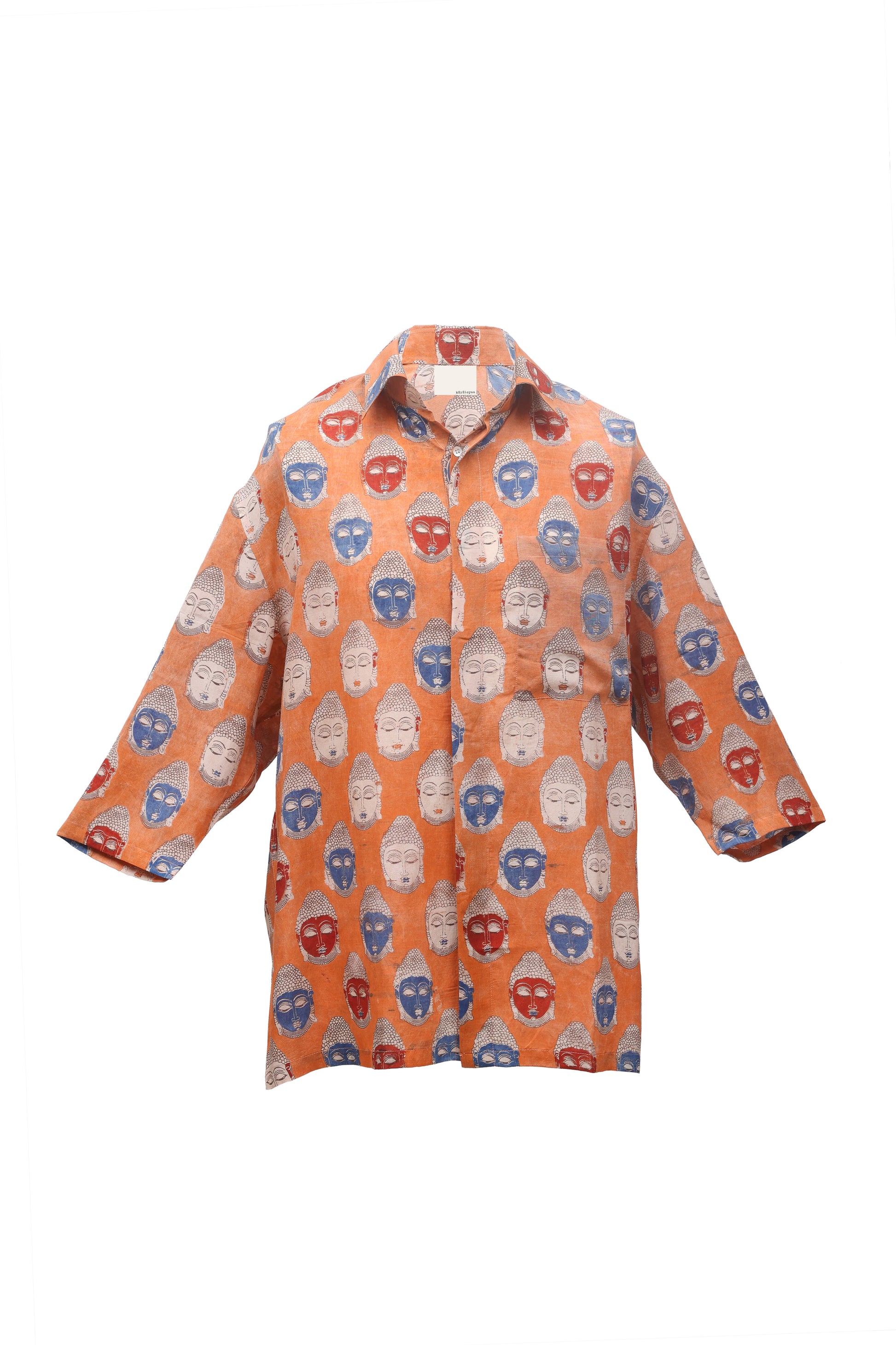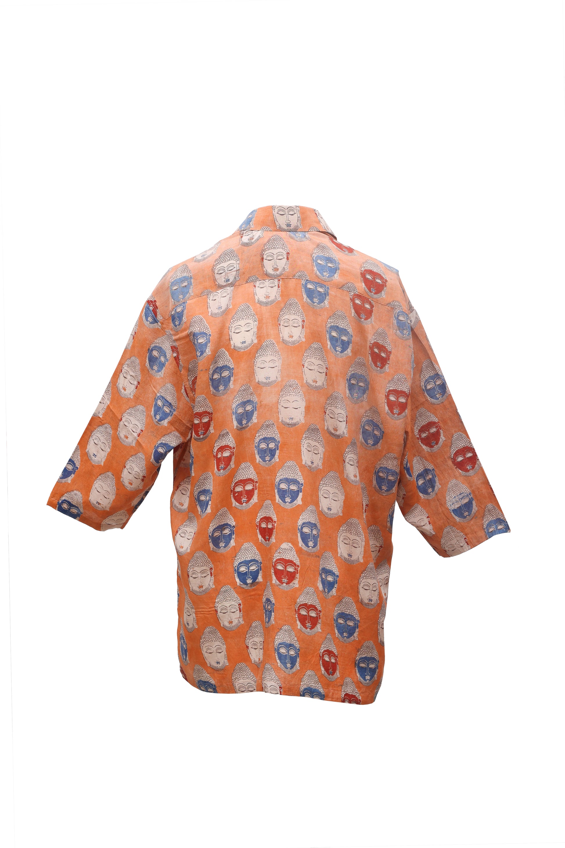 Introducing our one-of-a-kind, Shola Shirt. It has have sleeve, spread collar and a pocket. This product is cut for loose fit. This cotton shirt is adorned with contemporary Kalamkari motifs, crafted through hand block printing technique with Buddha heads all over it.