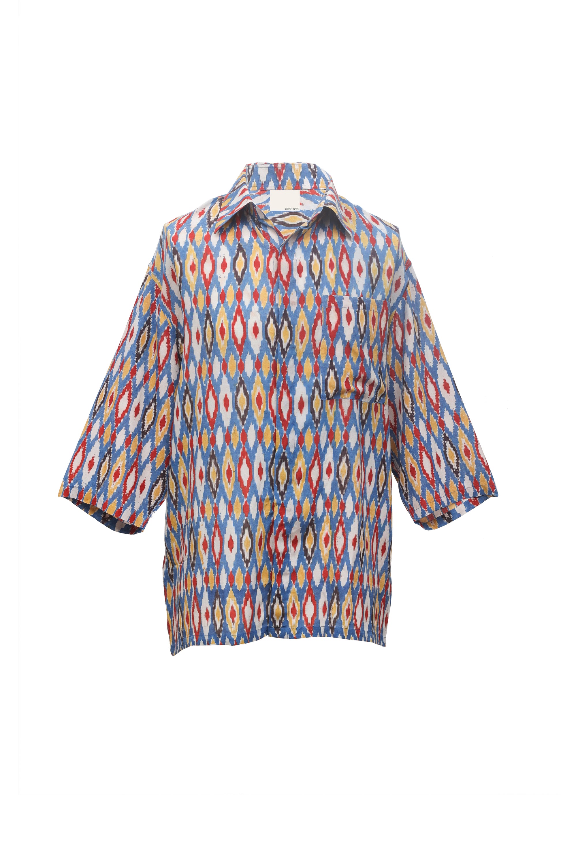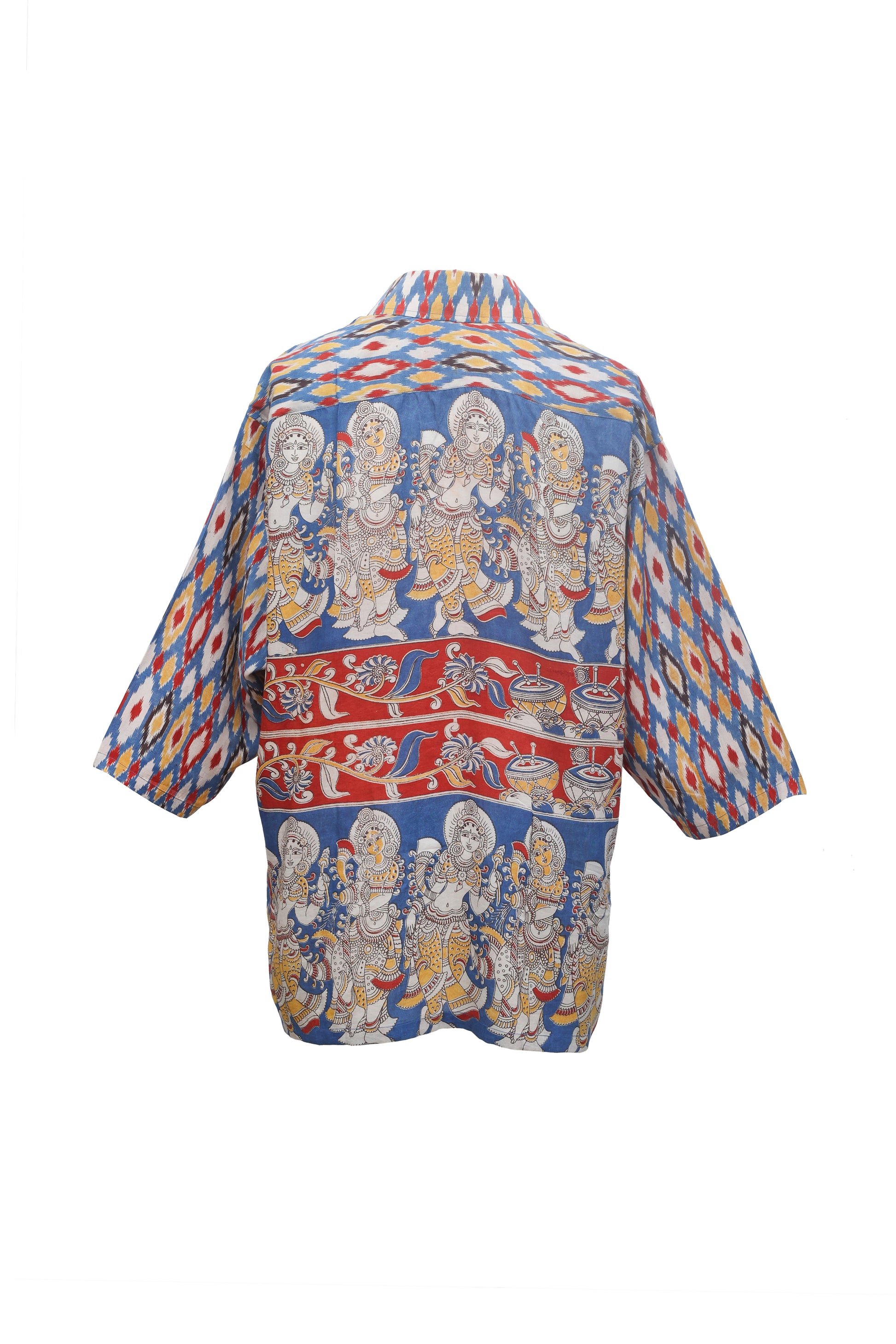 This shirt is created from vintage silk from Andra Pradesh, featuring screen printed ikat design on the front and fine kalamkari work at the back. It is done in traditional for the region colours of white, blue, red and yellow. The artwork showcases intricately drawn divine or royal female figures, which are a hallmark of Kalamkari art that often depicts Hindu mythology, temple art, and epics like the Ramayana and Mahabharata. The figures’ elaborate jewellery, facial expressions, and posture reflect traditional Indian artistic styles.