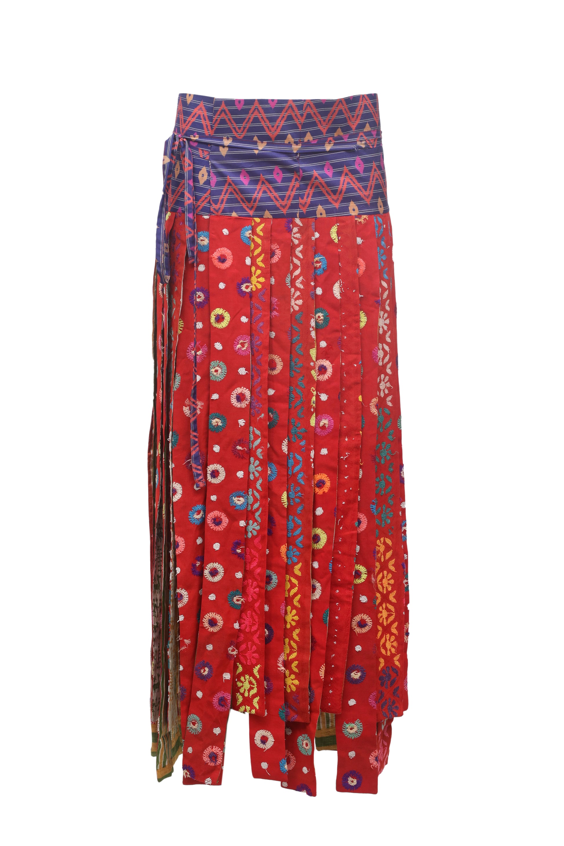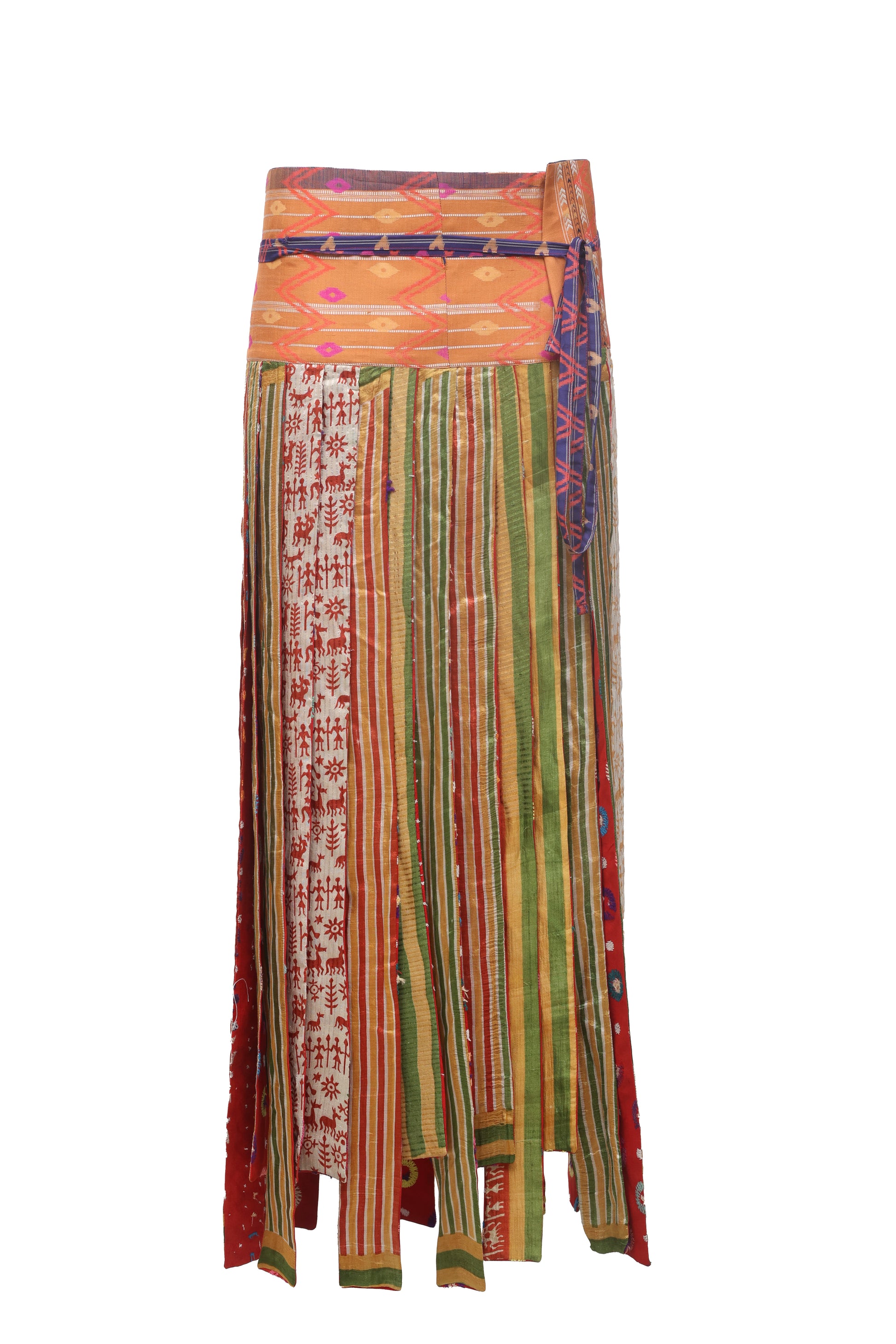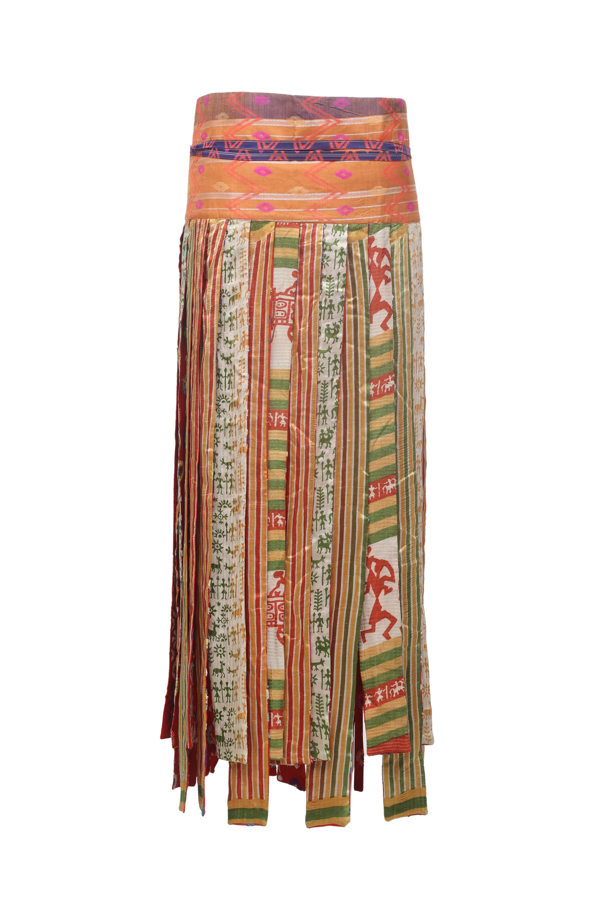 It is made of vintage silk and cotton and features several textile traditions of INdia, including block printing and embroidery. PIece is reversible and can be worn on either side.